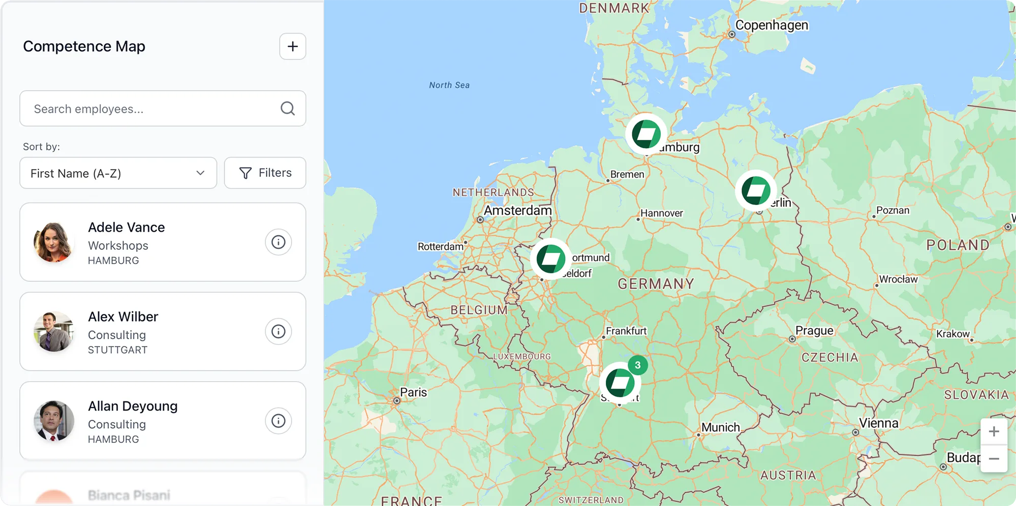 Perfekt für mittelständische Unternehmen mit mehreren Standorten oder internationale Konzerne mit verteilten Teams. Die Competence Map macht Wissen sichtbar, verkürzt Projektzeiten und stärkt die interne Zusammenarbeit.